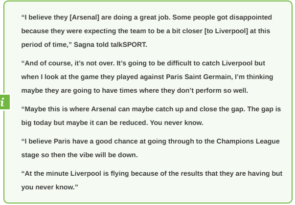 Sagna also believes Arsenal still have a chance of winning the Premier League despite Liverpool’s 13 points lead in the table.