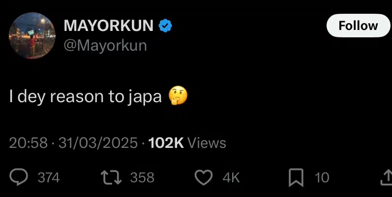 He wrote, “I dey reason to japa” (I’m considering relocating).