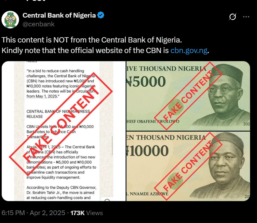 The Central Bank of Nigeria (CBN) has disowned a circular claiming the introduction of two new denominations—N5,000 and N10,000 notes. The bank described the circular as “fake” in a statement via its official handle on X (formerly Twitter).