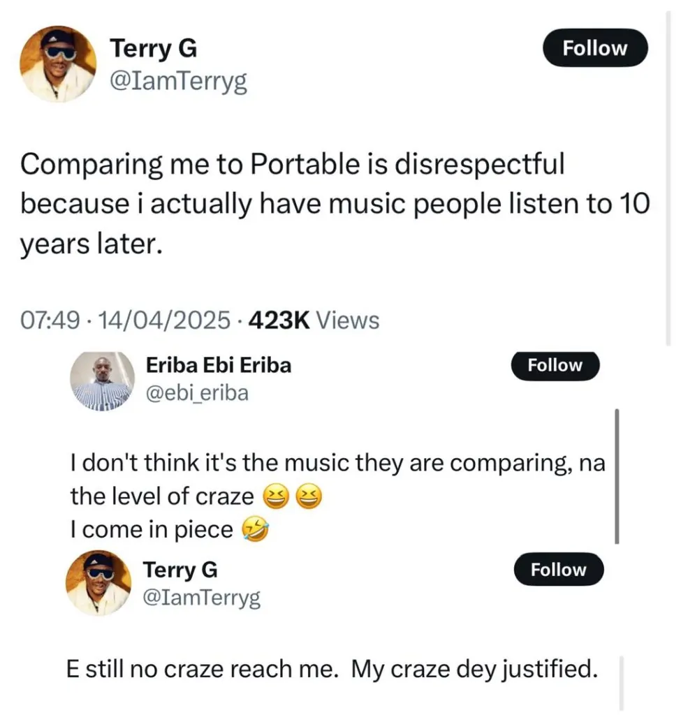 When a follower stated that it might be their ‘’crazy” disposition that brought about the comparison, TerryG opined that his own ‘craze’ is justified.