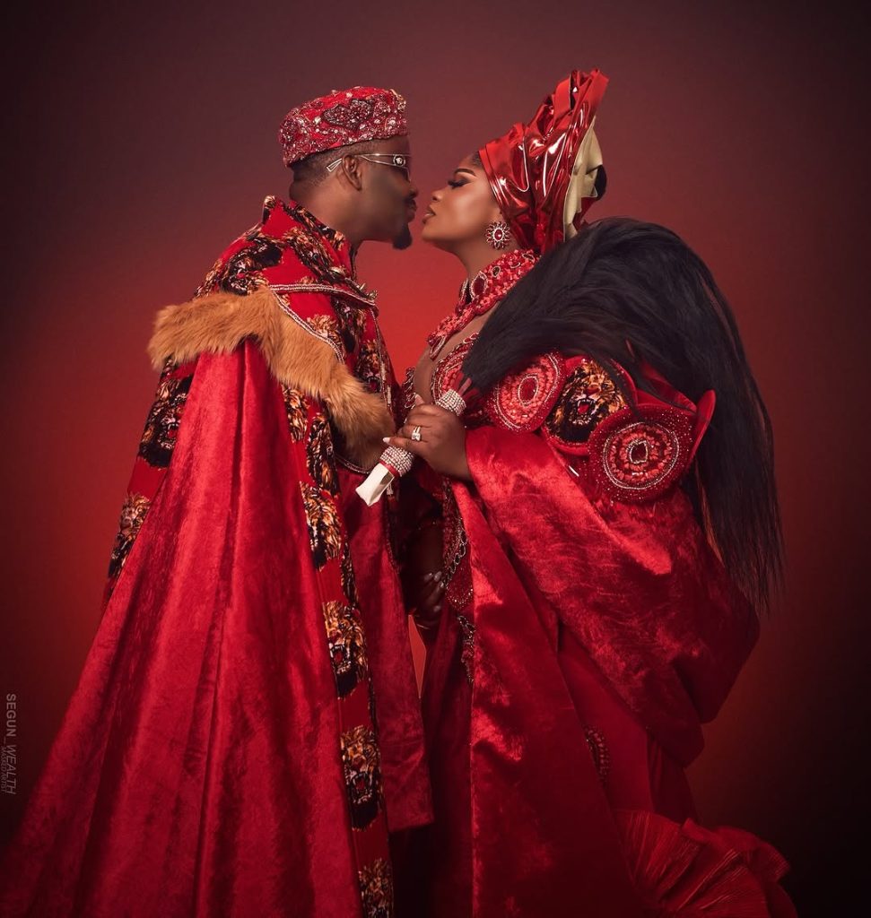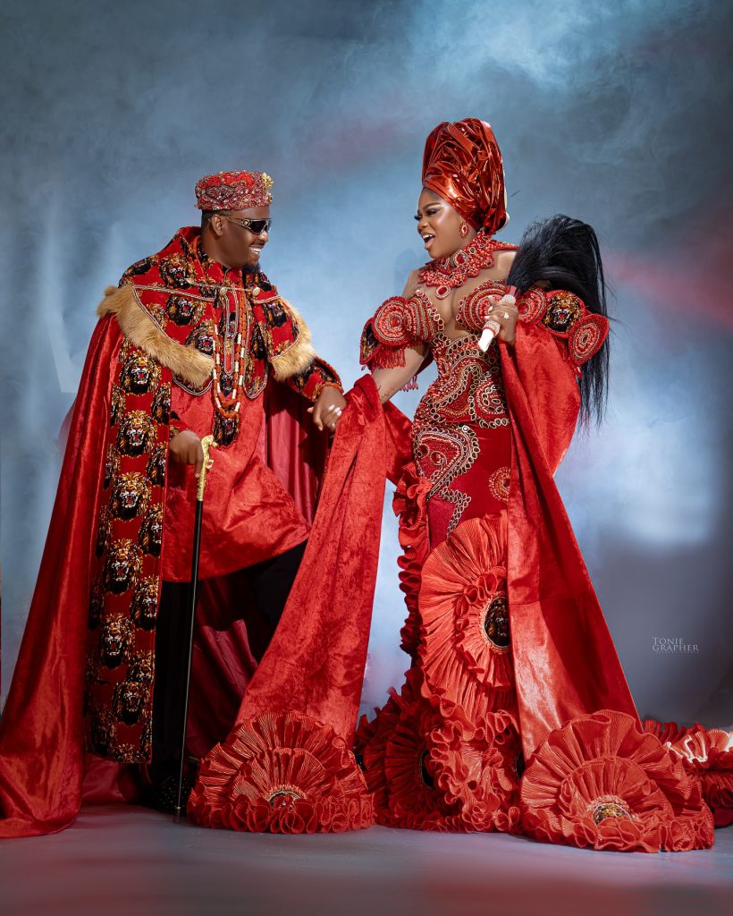 Matching in rich red outfits, Zubby stepped out in a red shirt, black trousers and a dramatic, flowing Isi Agu cape, complete with a black walking stick. Eniola looked just as striking beside him in a red gown paired with a bold gele and horsetail. It was a true twinning moment that lit up the carpet.