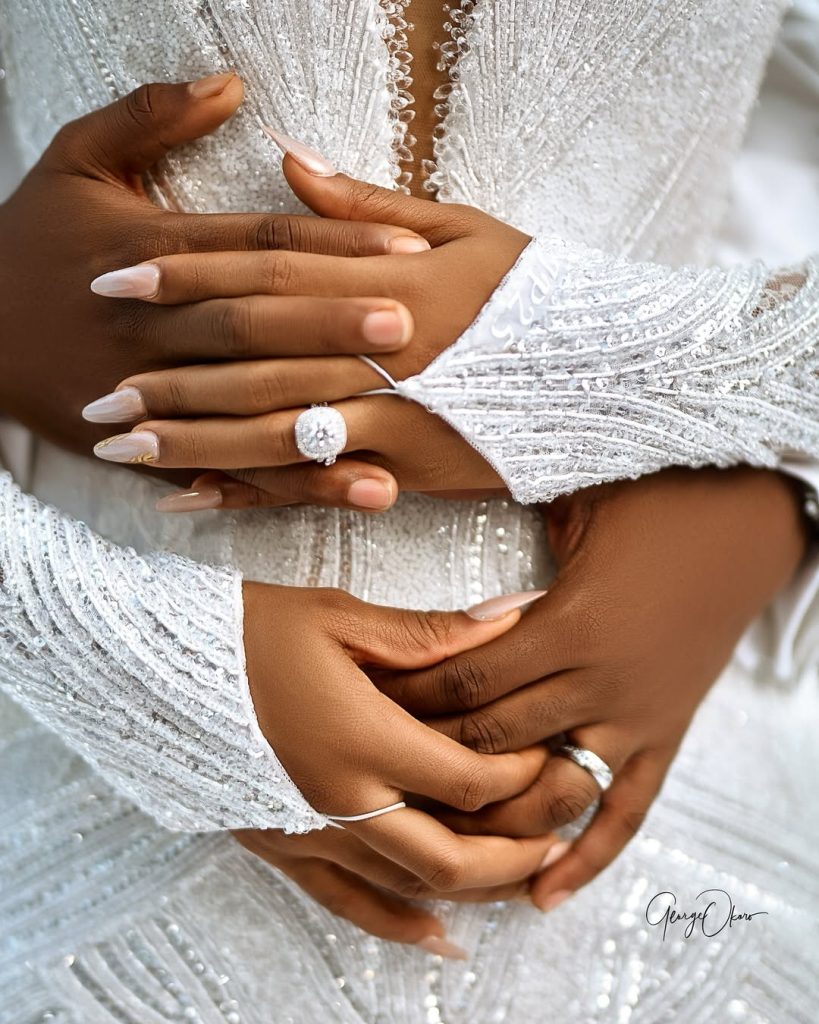 For their white wedding, the couple kept it classic and they looked amazing doing it. As expected, they both chose white for the big day, with Priscilla in a beautifully detailed long-sleeved gown. The dress featured sequins, lace and embellishments, with a high neckline, sheer yoke and a soft mermaid silhouette. Her hair was styled in an elegant updo, paired with simple stud earrings.