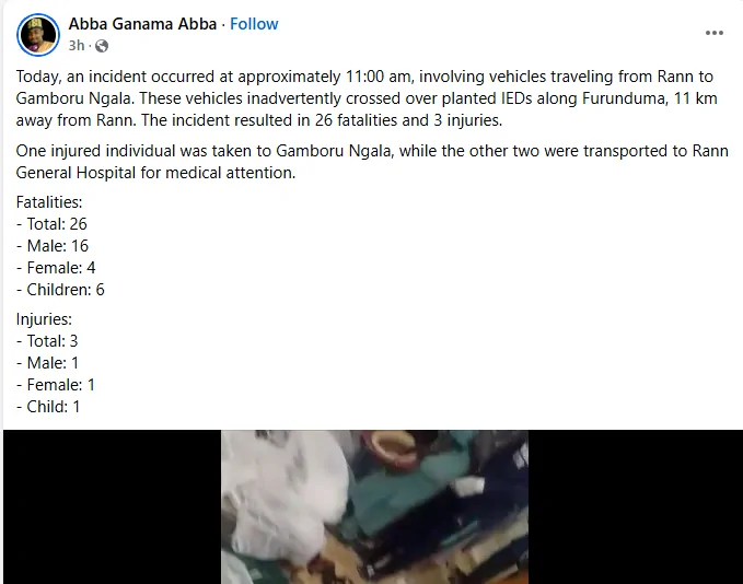At least 26 people, including four women and six children, were k!lled following an improvised explosive device (IED) attack along the Rann–Kala Balge to Gamboru Ngala road in Borno State.