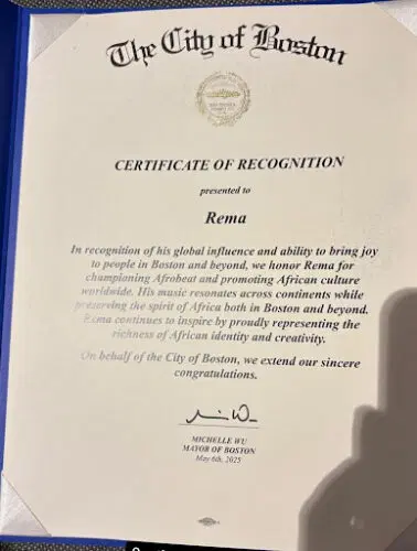 Afrobeats superstar Rema continues to make waves across the globe – this time, not just with his music, but with a prestigious honor from the city of Boston. Following his high-energy performance in the city last night, Rema was presented with a Certificate of Recognition by the Mayor of Boston, celebrating his contribution to music, culture, and global youth influence.
