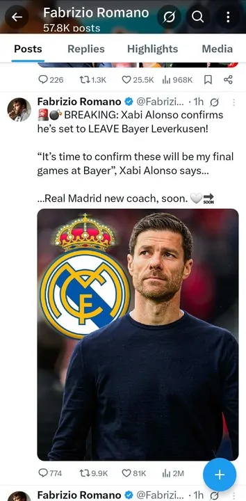 Xabi Alonso Leaves Bayern Leverkuson To Join Real Madrid Post author:Monique Post published:May 11, 2025 Post category:Sports Post comments:0 Comments After almost two-and-a-half years, and during the most successful period in the club’s history, our head coach, @XabiAlonso, will leave #Bayer04 at the end of the season. Tags: Sport News, Xabi Alonso Read more articles Previous PostCristiano Ronaldo Jr Earns First Portugal Call-Up After Al-Nassr Academy Breakthrough Next PostWrestling Legend Sabu Dead At 60 Weeks After Retirement Fight You Might Also Like Howe Targets ‘Game-Changing’ Champions League Return For Newcastle April 1, 2025 Transgender Swimmer Lia Thomas To Be Stripped Of Titles July 2, 2025 Six Barcelona Players, Including Rashford, Are Yet To Be Registered For 2025/26 LaLiga Season August 6, 2025 Leave a Reply Cancel replyCommentEnter your name or username to comment Enter your email address to comment Enter your website URL (optional) Save my name, email, and website in this browser for the next time I comment.