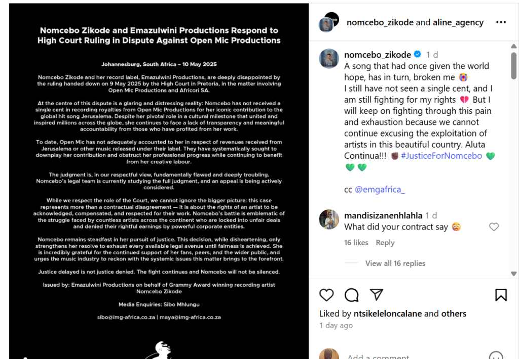 She described her emotional turmoil, stating, “It has broken me,” while emphasizing her resolve to continue advocating for fairness: “We cannot continue excusing the exploitation of artists in this beautiful country.” Her remarks have drawn global support, with fans and fellow artists amplifying her call for justice under the hashtag #JusticeForNomcebo.