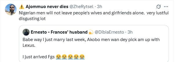 A newlywed Nigerian man, Dibia Ernesto, has taken to social media to lament over men with Lexus cars actively pursuing his wife.
