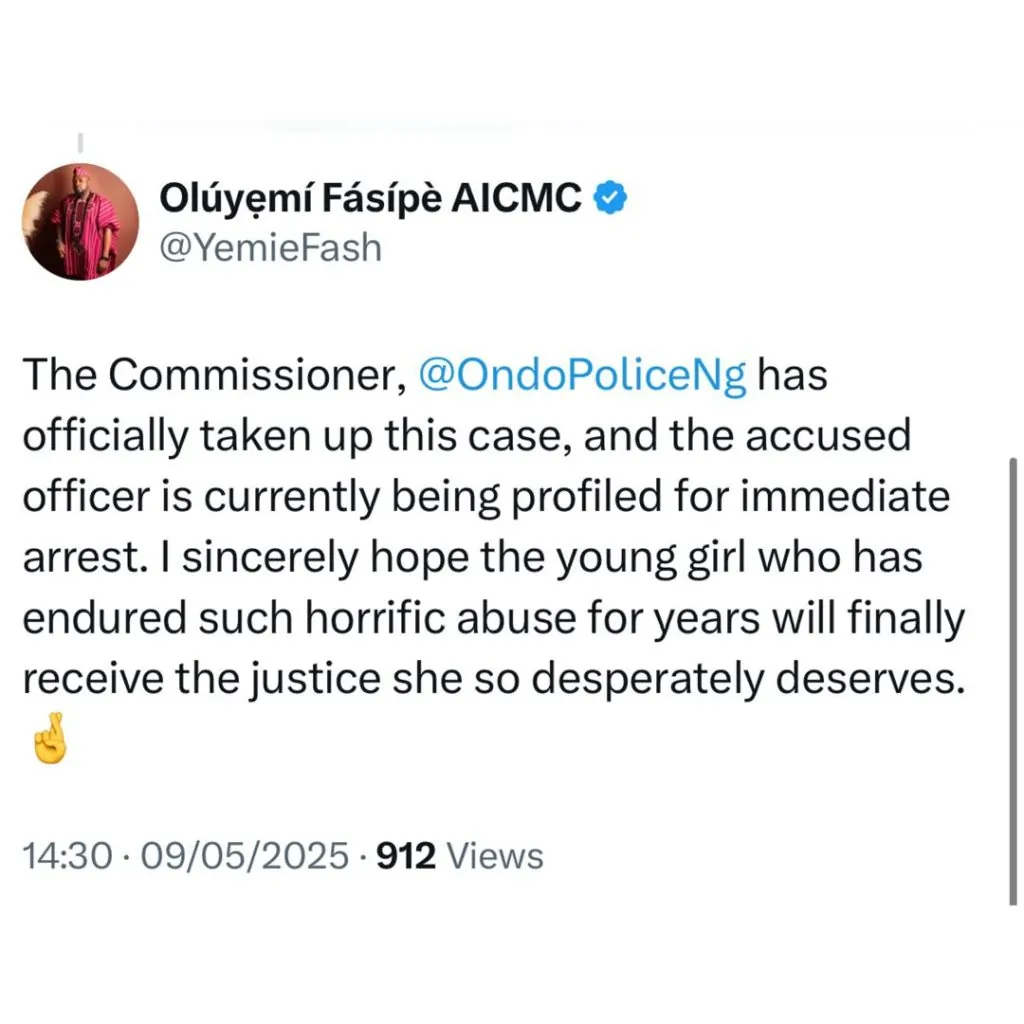 Fasipe mentioned that the state Commissioner of Police has stepped into the case and that the accused officer is being profiled for immediate arrest.