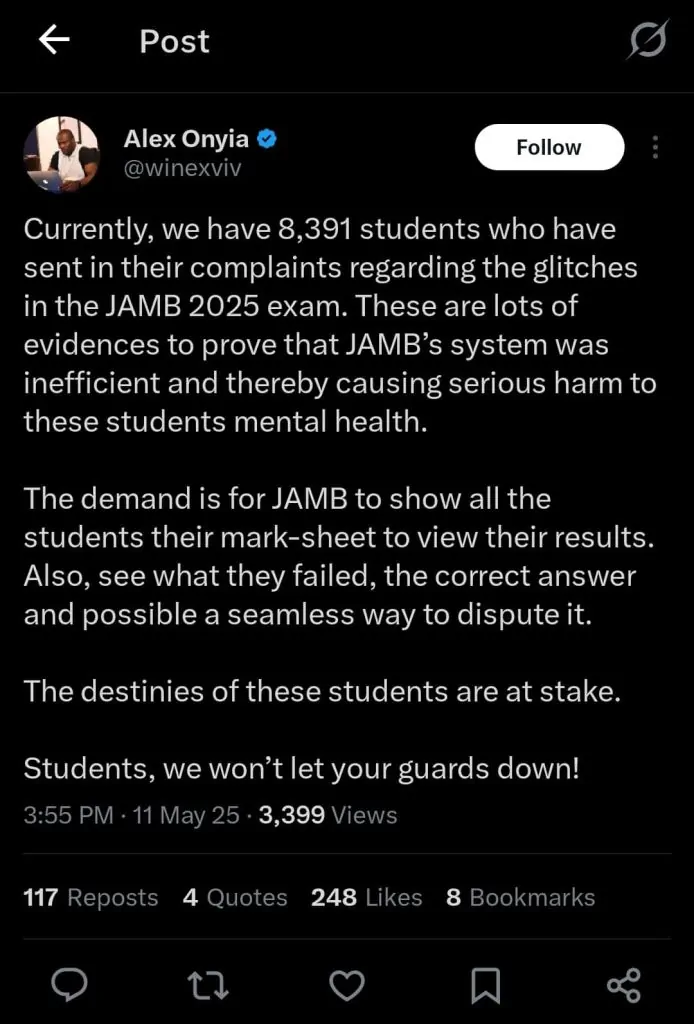 “Currently, we have 8,391 students who have sent in their complaints regarding the glitches in the JAMB 2025 exam,” @winexviv wrote. “There’s plenty of evidence that JAMB’s system was inefficient, causing serious harm to these students’ mental health.”