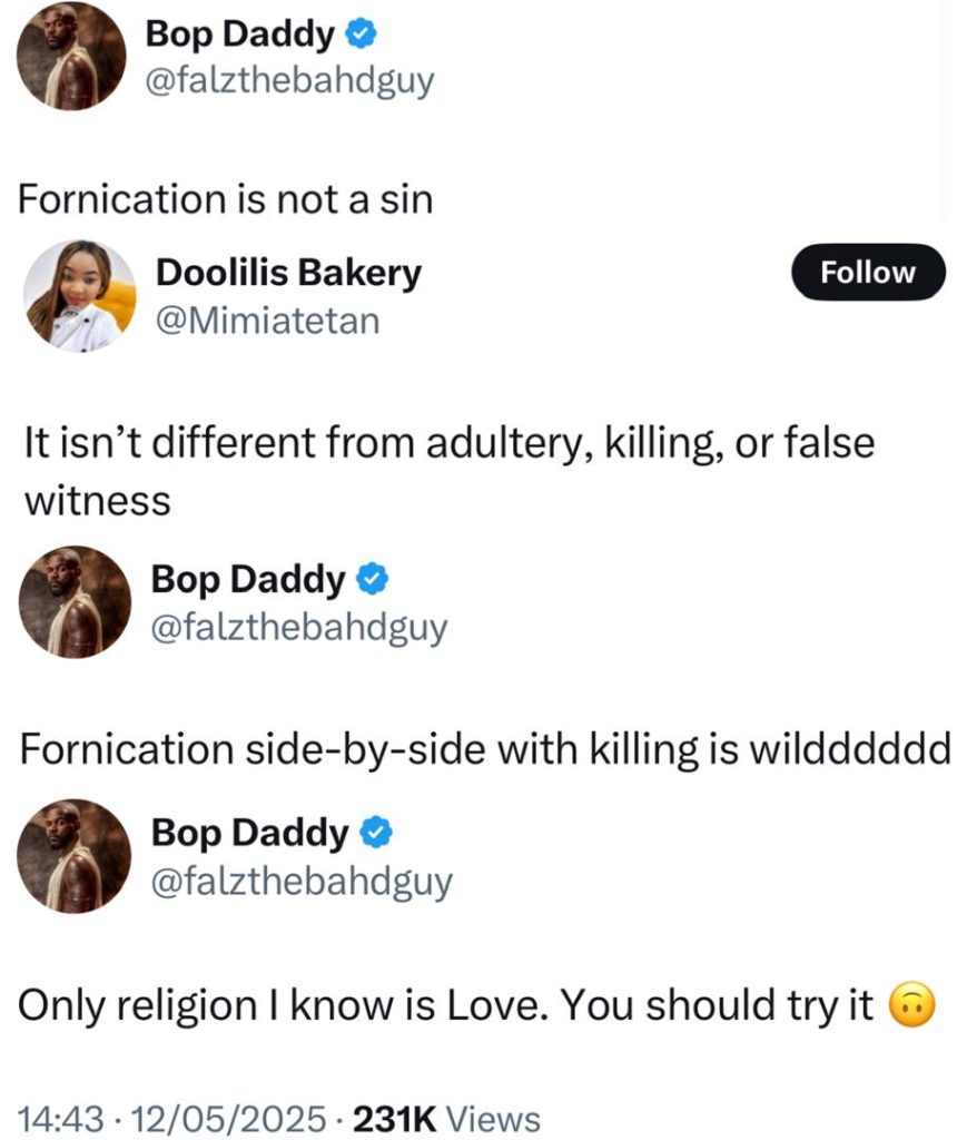 In an apparent disagreement with her submission, Falz said that putting fornication in the same category as k!lling is wild.
