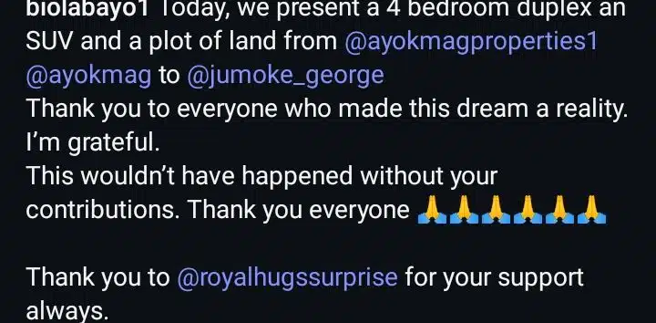 You are currently viewing Jumoke George Gifted 4-Bedroom Duplex, Plot Of Land, And An SUV