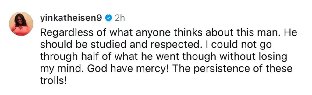 According to her, Yul needs to be studied as to how he has endured trolling from his haters online. In her post, Yinka said she would have lost her mind if she’s the one suffering persistent bashing online. Yul has been continuously dragged on social media after he picked his colleague, Judy Austin as a second wife. This decision has led to the end of his marriage to his estranged wife, May, who has insisted she will be partaking in polygamy.