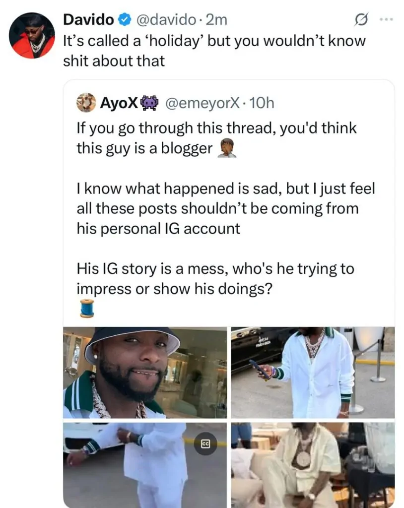 The X user had shared photos and videos Davido shared on social media from Ibiza, where he is vacationing with his 30BG members.