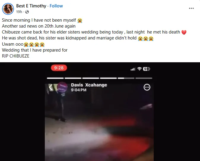 Sources close to the family say that Chibueze had been excited about his sister’s wedding, scheduled for the following day, and had taken it upon himself to help with logistics and preparations.