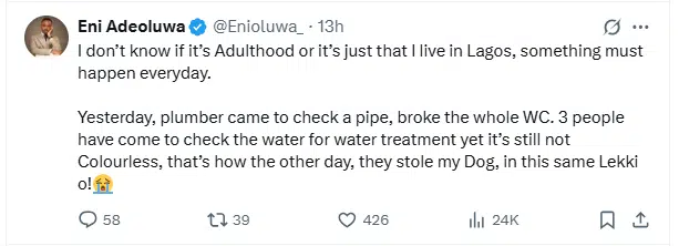 Yesterday, plumber came to check a pipe, broke the whole WC. 3 people have come to check the water for water treatment yet it’s still not Colourless, that’s how the other day, they stole my Dog, in this same Lekki o!”