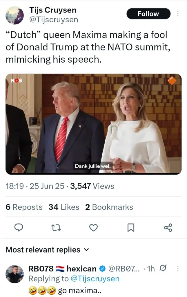 Queen Máxima then glanced into the lens and pulled a near-perfect imitation of Trump’s facial expression, a move that viewers instantly interpreted as mockery.