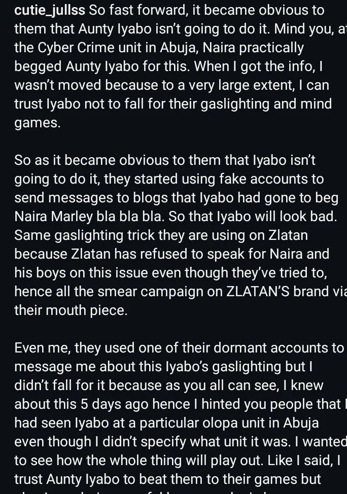 Furthermore, Cutie Juls claimed that Naira Marley’s legal team accused Iyabo Ojo of exonerating the singer.
