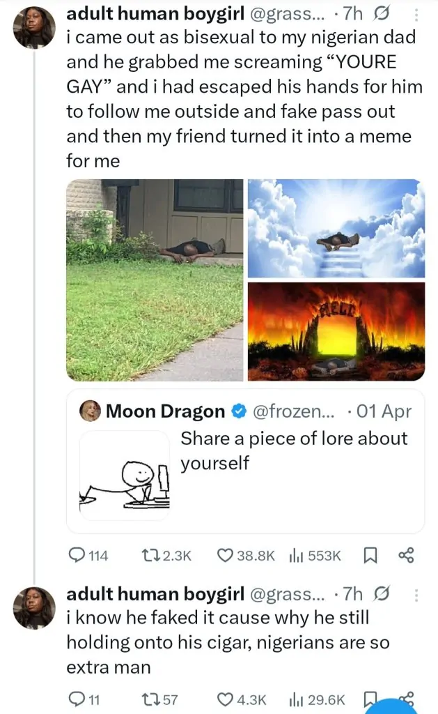 She shared a photo of her father lying down outside after pretending to collapse and wrote: “I came out as bisexual to my nigerian dad and he grabbed me screaming ‘YOURE GAY’ and i had escaped his hands for him to follow me outside and fake pass out and then my friend turned it into a meme for me.”