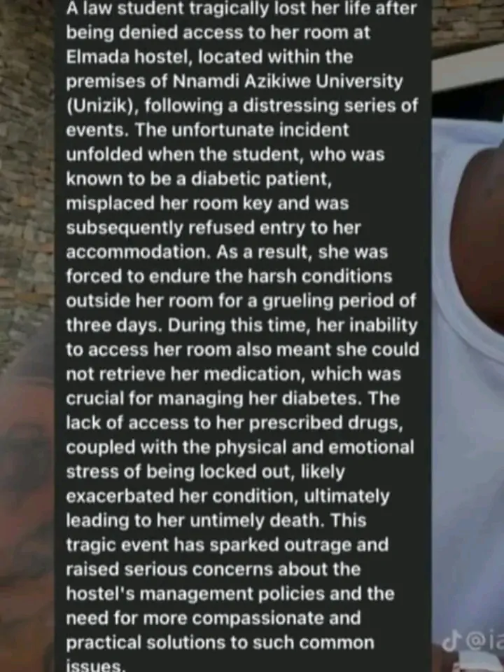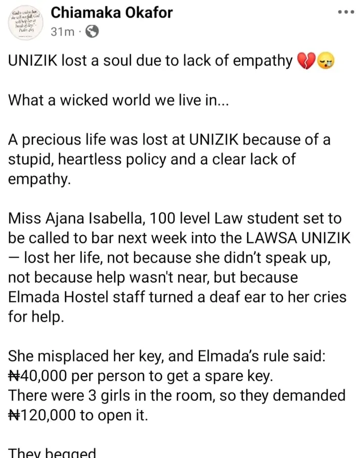Tragedy reportedly strikes Nnamdi Azikiwe University (UNIZIK) following the passing of a law student, Ajana Chioma Isabella.