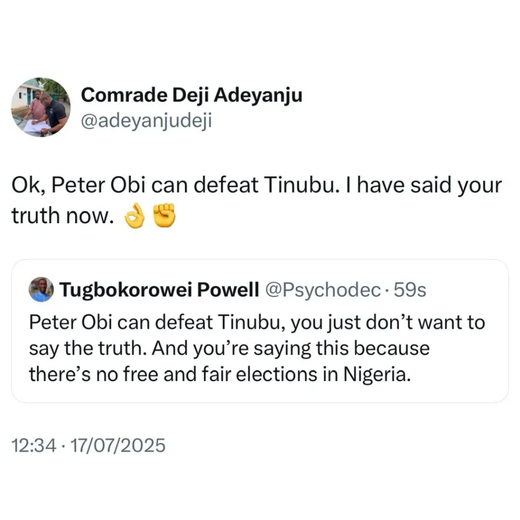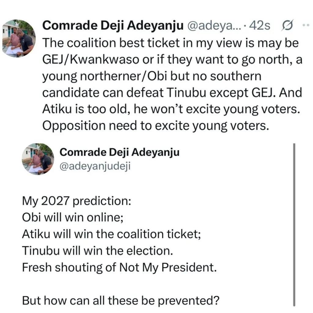 In a post shared on his X handle, Adeyanju said the best ticket from the coalition group to defeat Tinubu in the 2027 election should be a Goodluck Jonathan/Rabiu Kwankwaso ticket or a younger Northerner paired with Peter Obi. He argued that Atiku will not excite the younger voters and so might lose their votes.