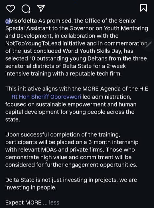 The onboarding of the selected trainees took place yesterday, and classes commenced today, and will progress until the time of training is over. This goes to show that The Delta State Governement is investing in her people and not just in projects and the youths and the good people of Delta can expect MORE.