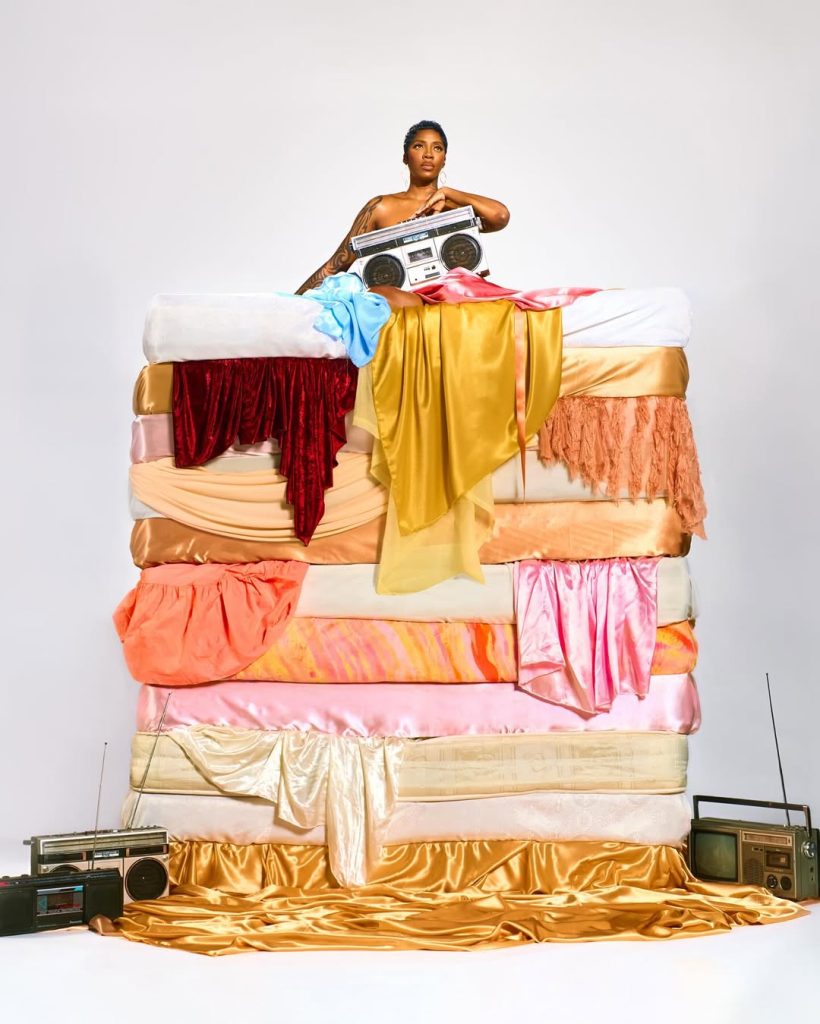She made the announcement on Instagram with a photo that looks like something out of a fairytale-slash-retro dream. Tiwa is sitting on a beautiful tall stack of pastel and jewel-toned mattresses, holding a silver boombox. The vibe is Afro princess meets vintage nostalgia. It’s theatrical in the quietest, most thoughtful way.
