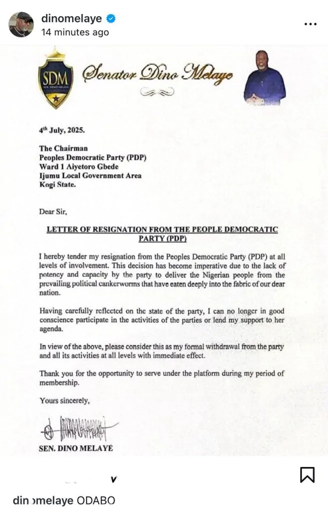 Former Senator and 2023 Kogi State governorship candidate Dino Melaye has formally resigned from the Peoples Democratic Party (PDP), citing the party’s inability to deliver Nigeria from what he described as “prevailing political cankerworms.”