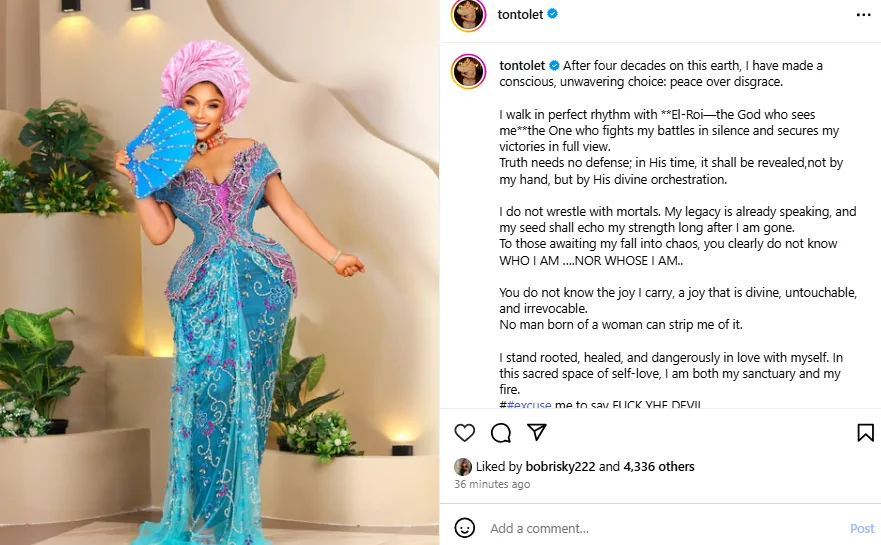 In a post shared on her Instagram page this evening, the mum of one stated that after forty years on earth, she has made a conscious decision to choose her peace over disgrace. She added that no man born of a woman would not strip her of the joy she has now.