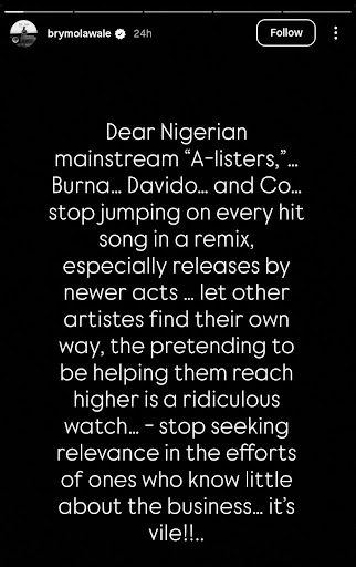 “Dear Nigerian mainstream A-Listers, stop jumping on every hit song in a remix, especially releases by newer acts.”