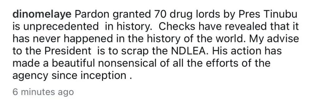 In a post shared on Instagram, Dino said the President by his action has made a “nonsensical of all the efforts” of the National Drug Law Enforcement Agency NDLEA to eradicate drug trafficking in Nigeria. He said the President needs to scrap the agency following his granting of the presidential pardon to 90 drug offenders.