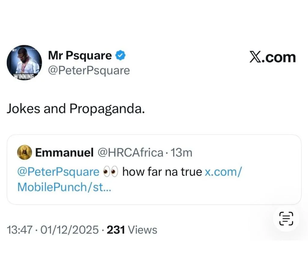 Back in 2024, Peter dragged his brothers before the anti-graft agency, claiming that Jude diverted funds belonging to P-Square, operated 47 undeclared bank accounts, and manipulated the shareholding structure of Northside Entertainment Ltd., a company jointly owned by the brothers.