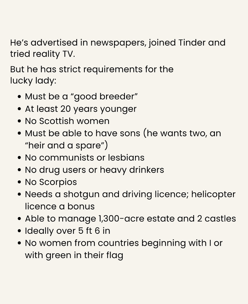 Sir Slade is reportedly advertising for a woman in her 20s or 30s who is willing to marry him and produce a male child.