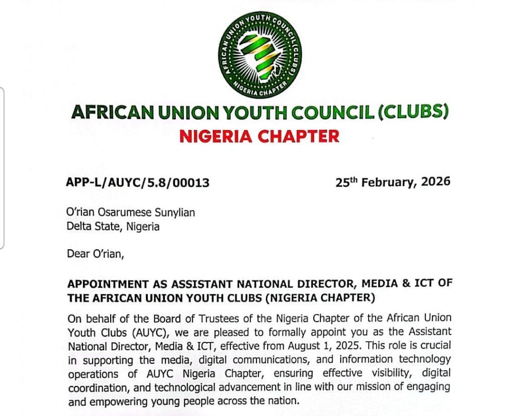The African Union Youth Council Clubs Nigeria Chapter has announced the appointment of Amb. Comr. O’rian O. Sunylian as Assistant National Director, Media and ICT.